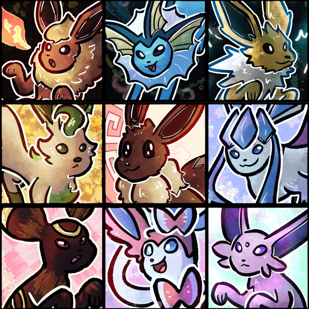 A set of phone/vertical wallpapers featuring the eeveelutions! Had a lot of fun with these, and I even drew a few of them on stream!